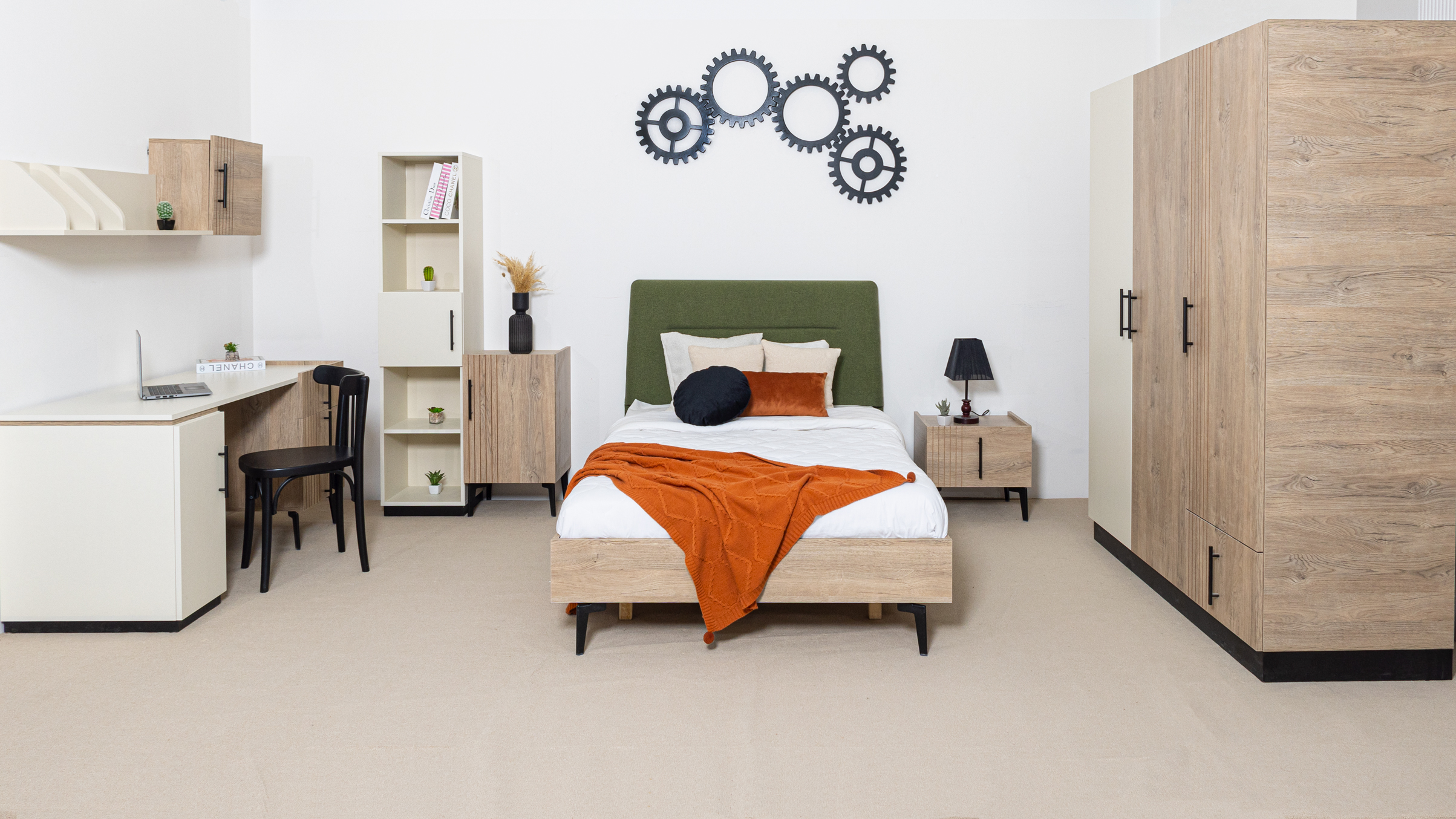 Des touches de couleur orange viennent égayer l’espace, que ce soit à travers des coussins ludiques ou des décorations, apportant une ambiance joyeuse et dynamique. Les meubles, adaptés à leur taille, allient fonctionnalité et design ludique, offrant des espaces de rangement pratiques tout en étant esthétiques.