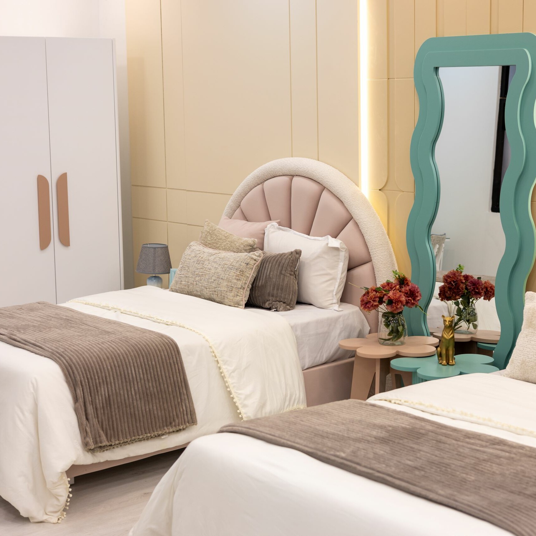 Plongez dans l’univers magique de notre chambre enfant, conçue pour stimuler l’imagination et le bien-être des petits. Les teintes douces de vert et de beige créent une atmosphère apaisante qui favorise le repos et la créativité.