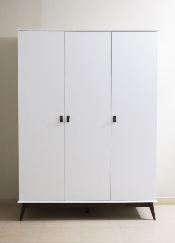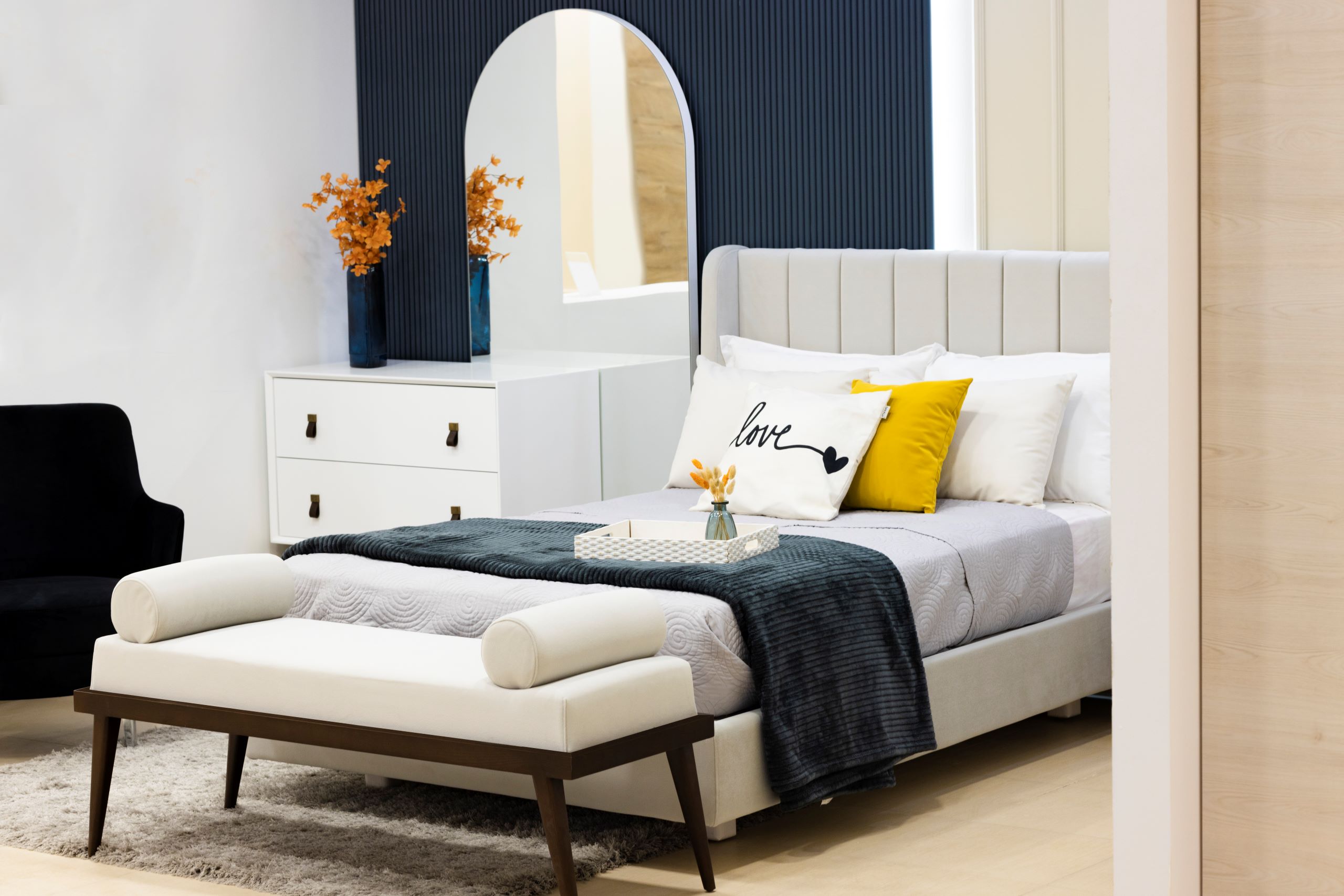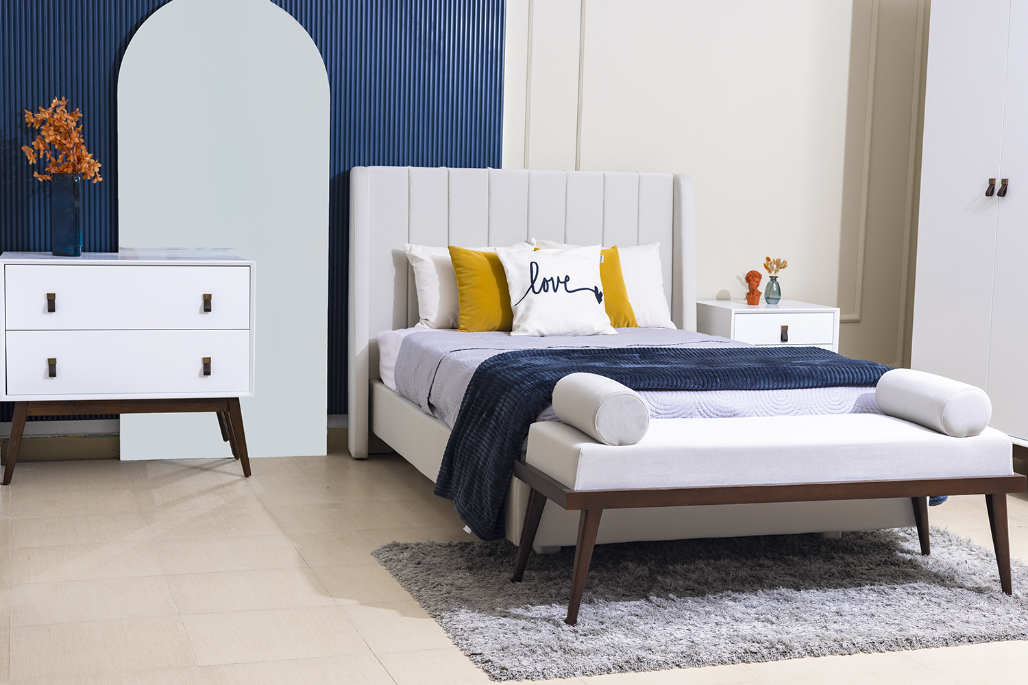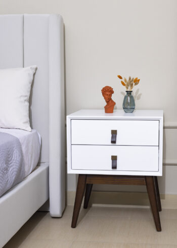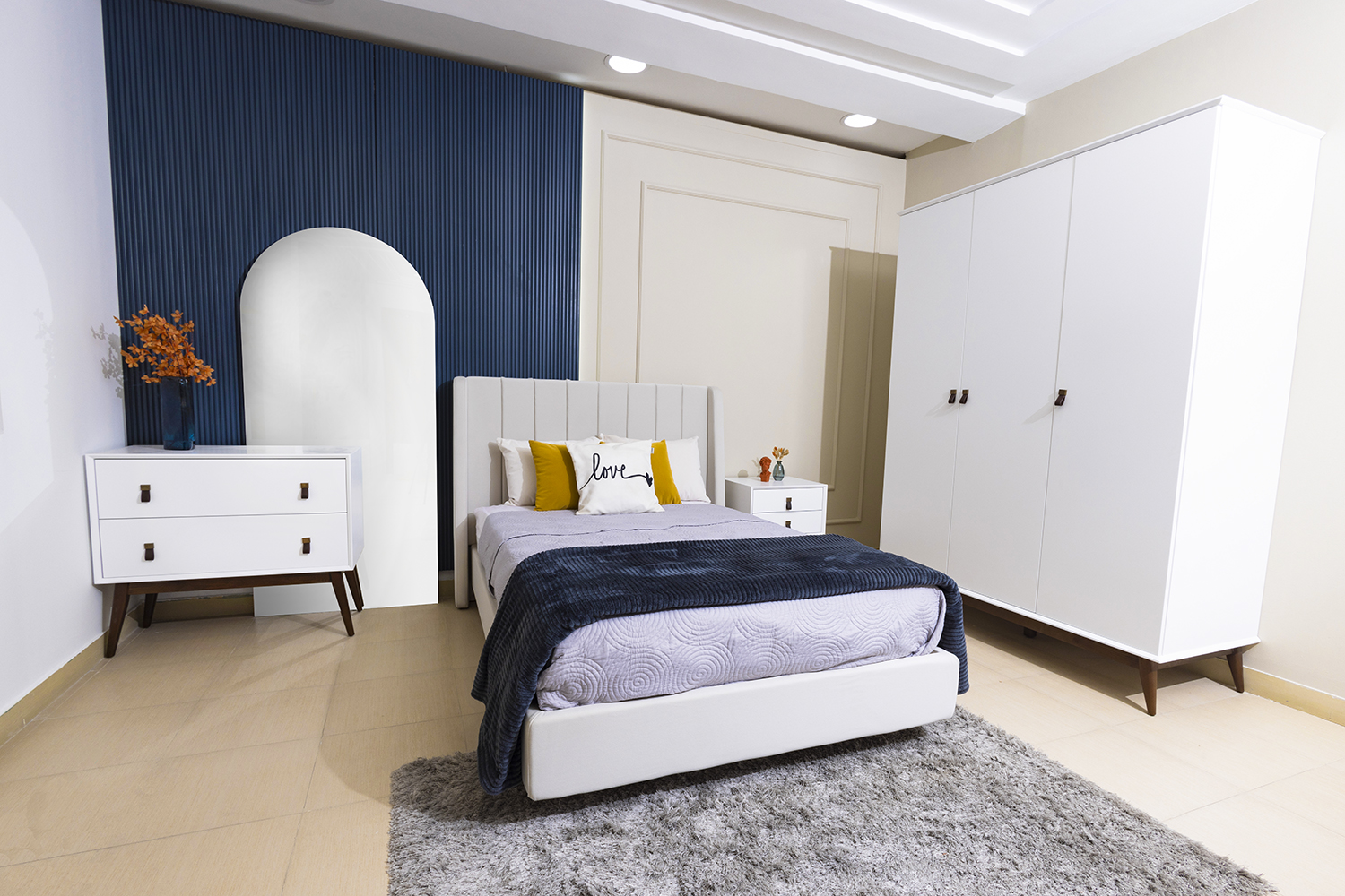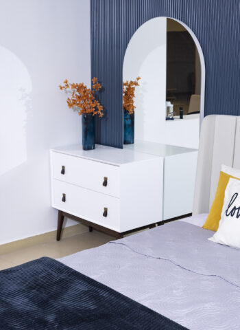 La table de nuit assortie offre un espace pratique pour lampes et livres, tandis que la garde-robe spacieuse permet un rangement efficace. La coiffeuse, avec son miroir chic, crée un coin beauté parfait pour se préparer avec aisance.