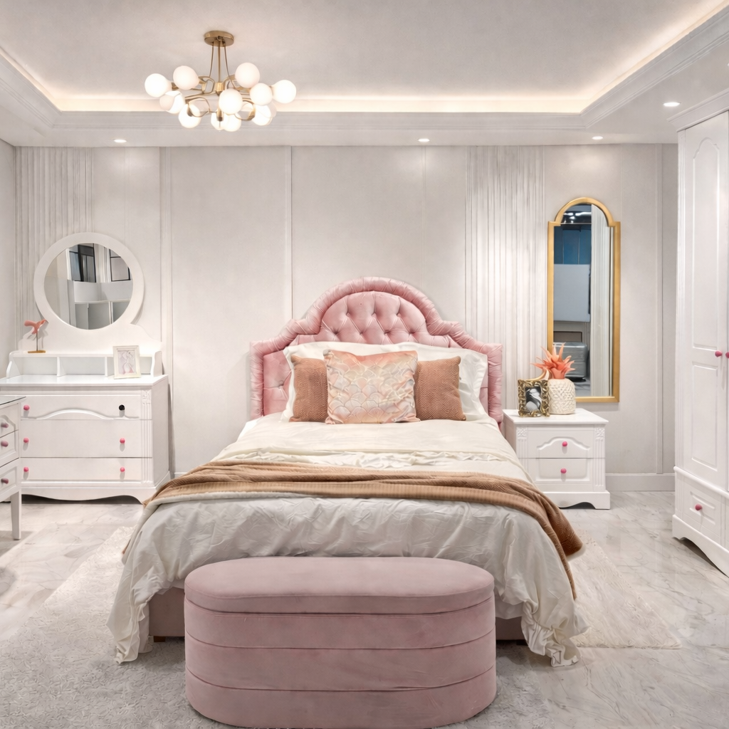 Un bureau bien agencé fournit un espace idéal pour l’étude ou les loisirs créatifs, tandis qu’une niche décorative ajoute une touche personnelle à l’ensemble. Chaque élément de la chambre Iris est pensé pour créer un espace harmonieux, accueillant et inspirant.