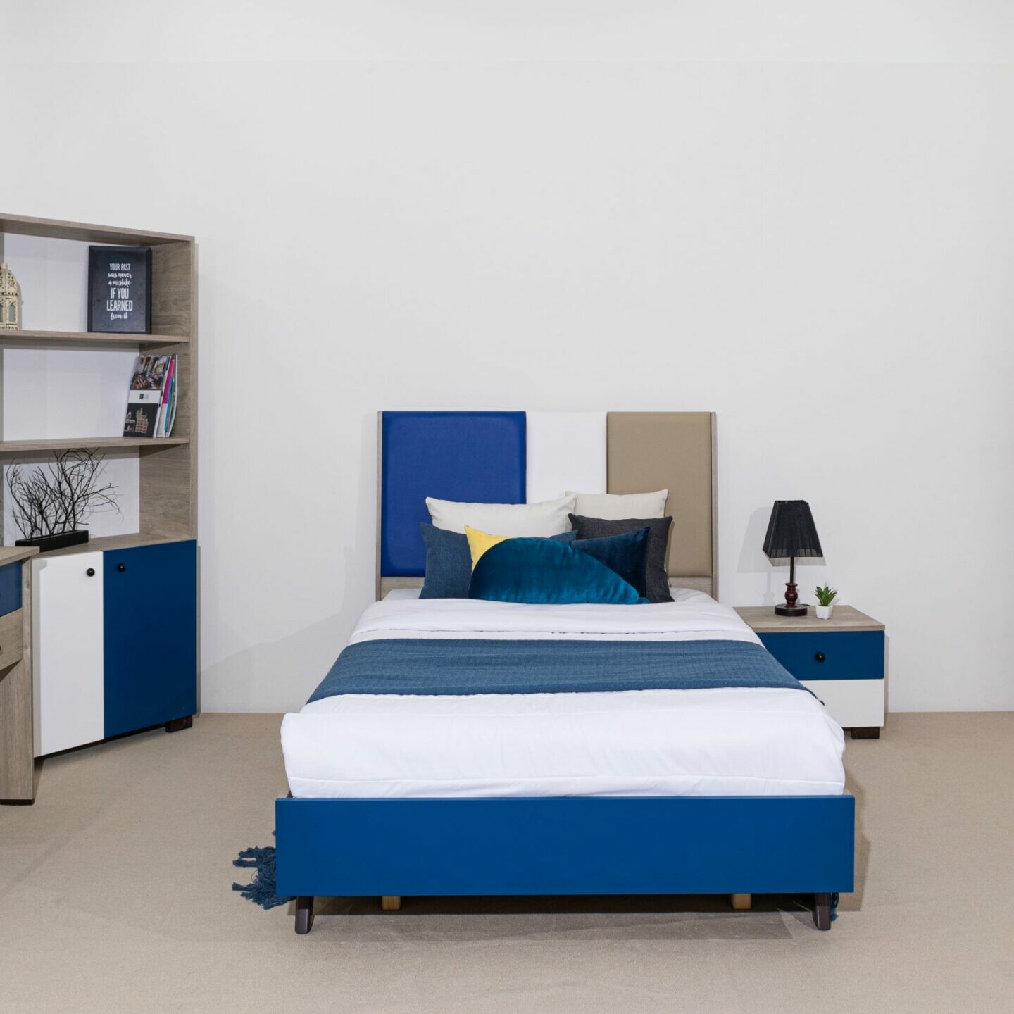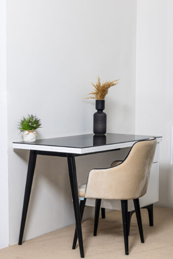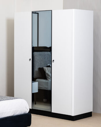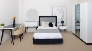 La garde-robe offre un rangement généreux sans compromettre l’esthétique. Une coiffeuse chic, idéale pour se préparer, et un bureau bien agencé fournissent des espaces pour l’étude ou la créativité.
