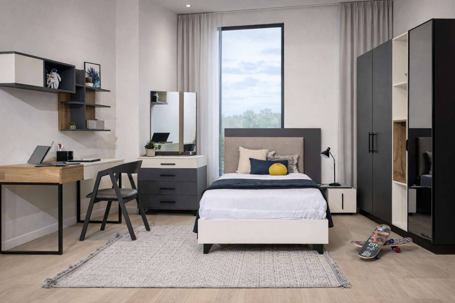 Sur la gauche, un ensemble de rangements modulaires — armoire, étagères et commode — offre une capacité de stockage importante tout en conservant une ligne épurée. Un instrument décoratif apporte une touche artistique.
