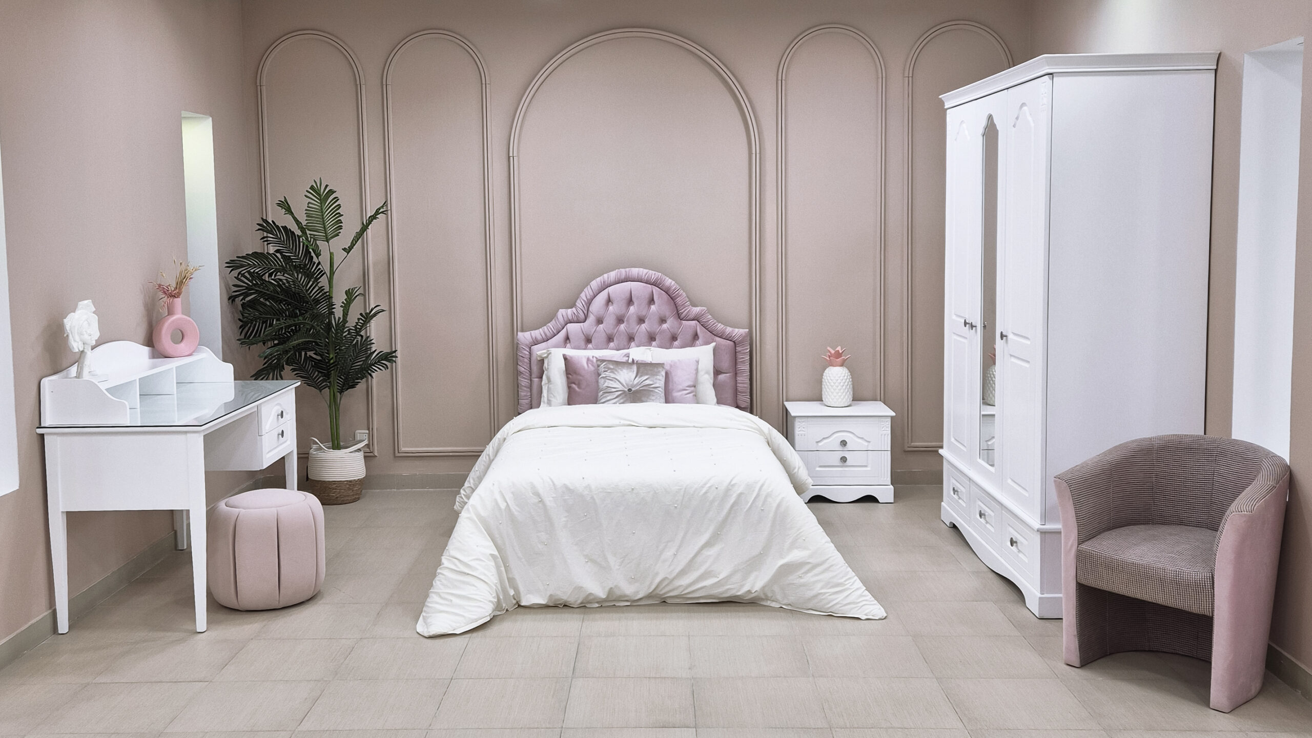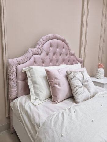 Cette chambre pour fille allie confort, élégance et une touche de féérie. Le lit en velours rose se démarque par son design délicat.