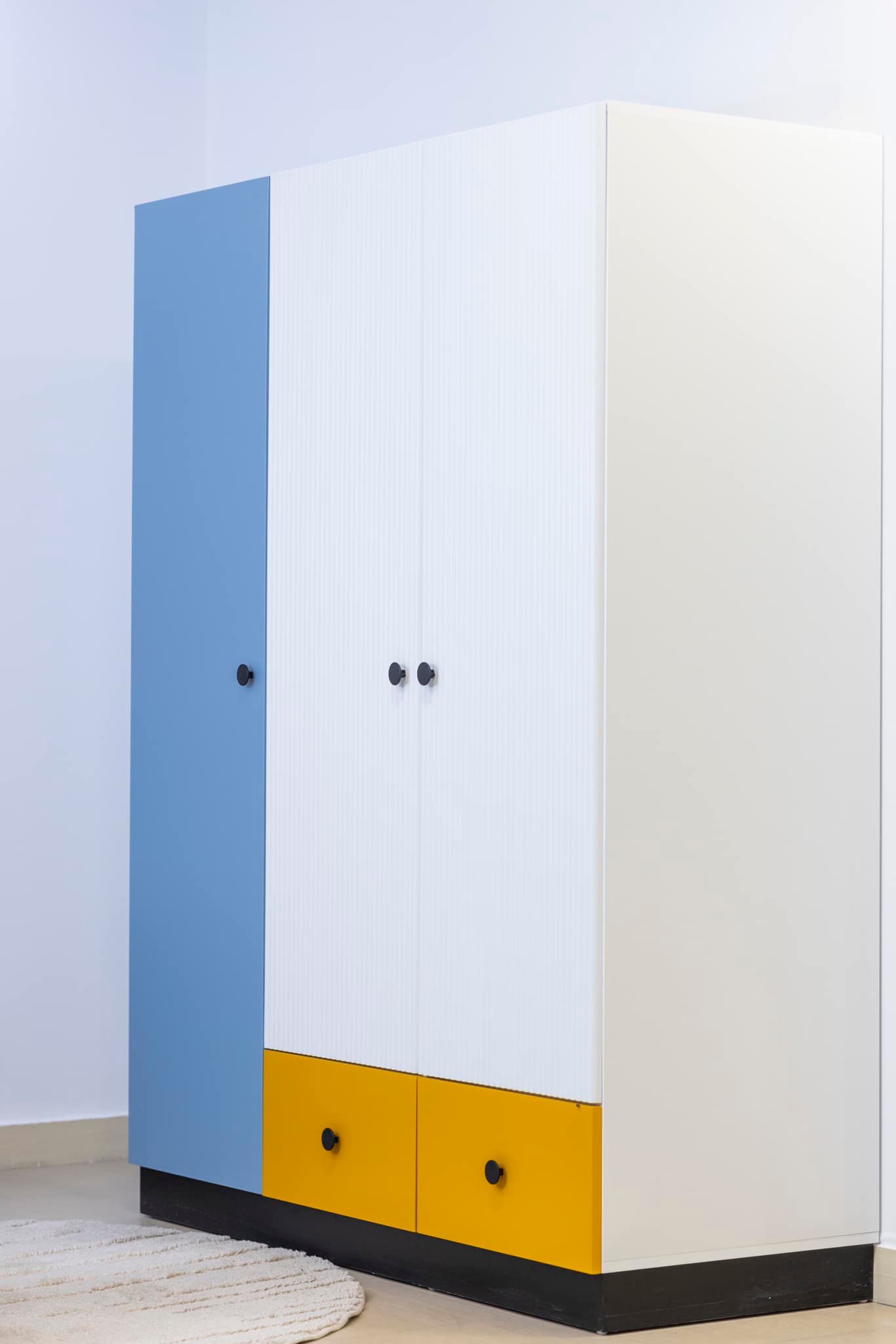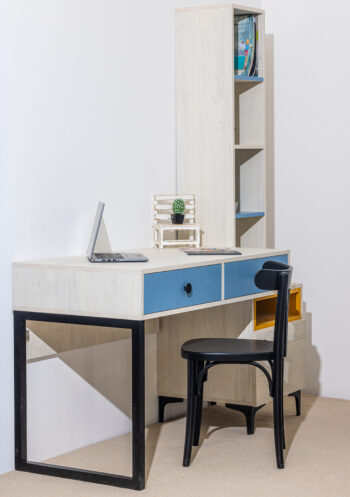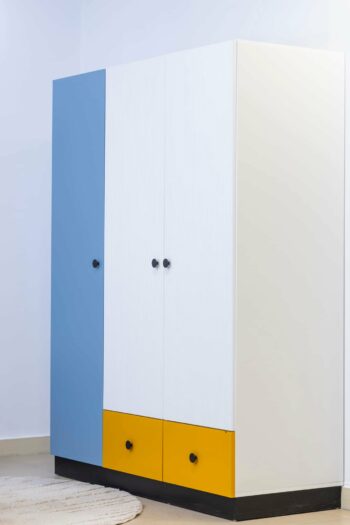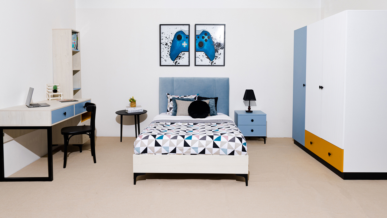 Les accents orange, présents dans les accessoires et les coussins, dynamisent l’ensemble, apportant chaleur et vivacité. Cette chambre est conçue pour le confort et le style, avec un mobilier fonctionnel qui allie esthétique et praticité.
