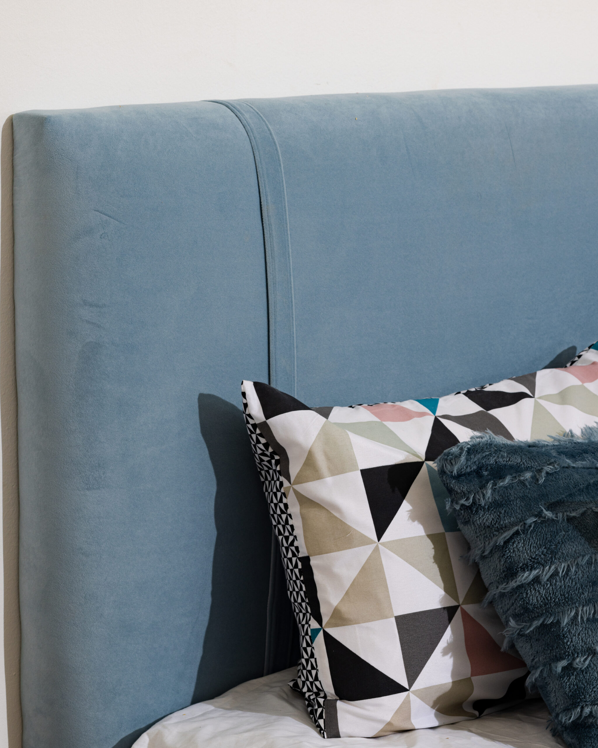 Découvrez la chambre New, un espace chic et contemporain, où le bleu et le beige se mêlent harmonieusement. La tête de lit capitonnée apporte une touche de luxe et de confort, invitant à la détente après une longue journée.