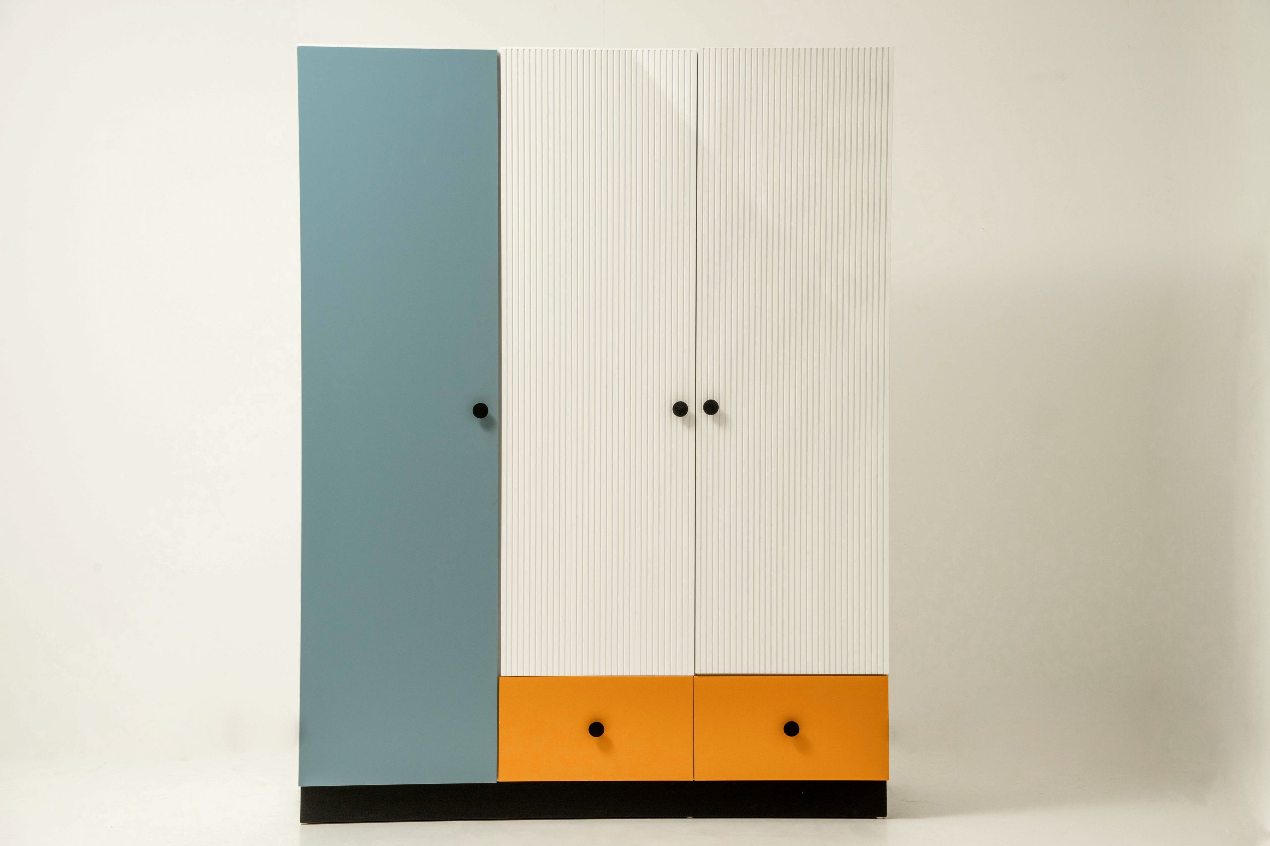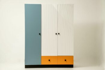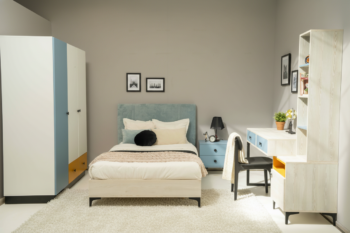 Les accents orange, présents dans les accessoires et les coussins, dynamisent l’ensemble, apportant chaleur et vivacité. Cette chambre est conçue pour le confort et le style, avec un mobilier fonctionnel qui allie esthétique et praticité.