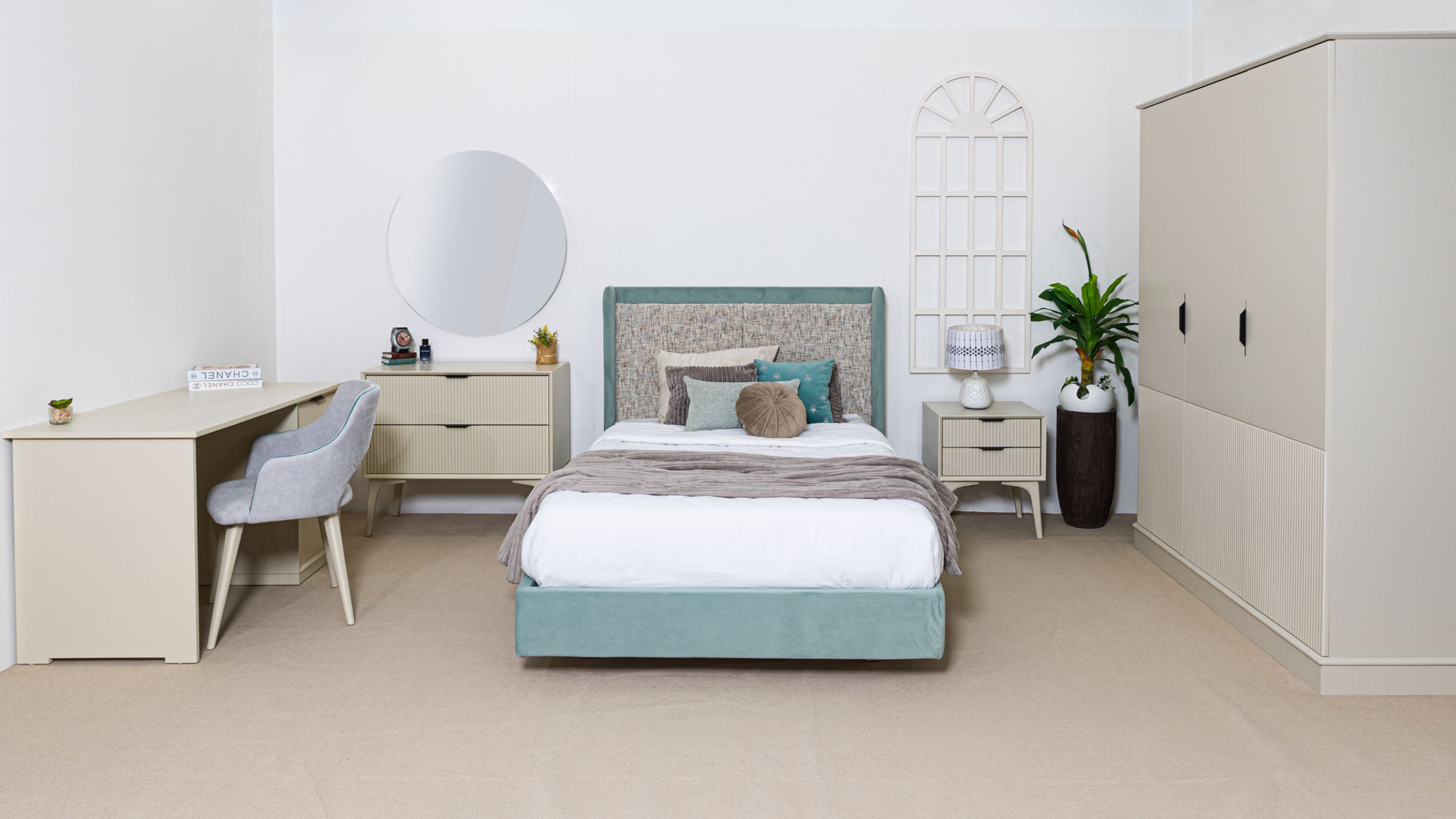 La chambre Stellito en beige allie classe et confort avec son design élégant et raffiné. Le lit capitonné, pièce maîtresse de l’espace, offre un confort optimal et un style intemporel.