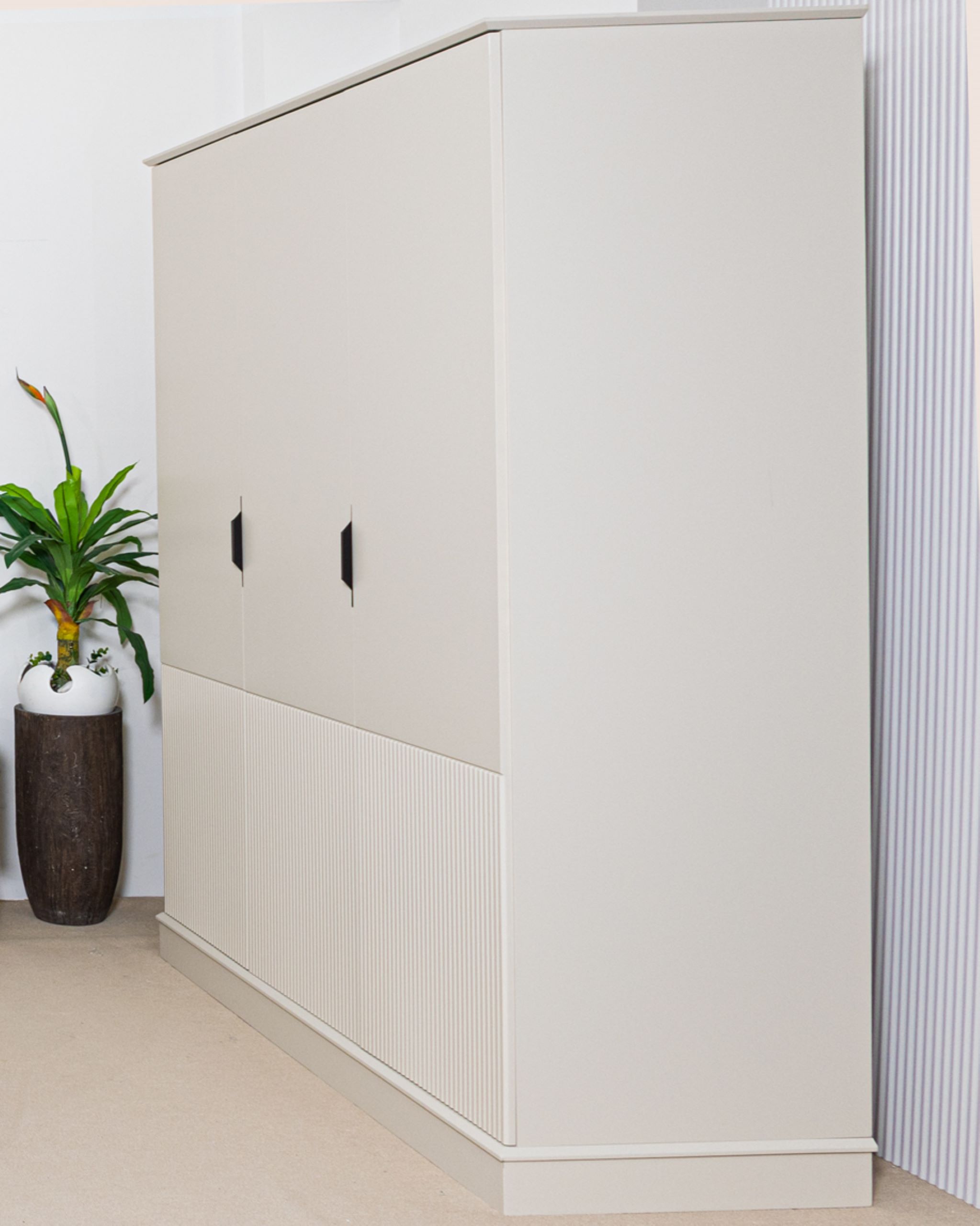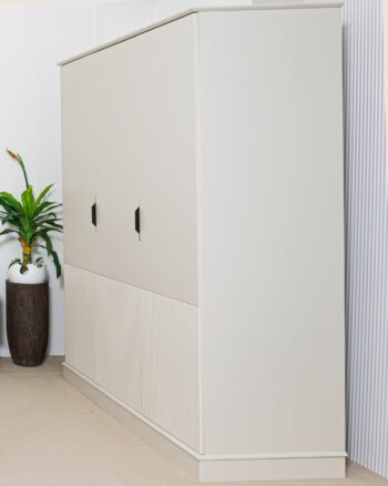 La table de nuit, assortie, apporte une touche pratique tout en complétant l’esthétique de la chambre. La garde-robe spacieuse assure un rangement efficace, tandis que la coiffeuse, avec ses dimensions de 980 cm x 480 cm, crée un coin beauté chic et fonctionnel.