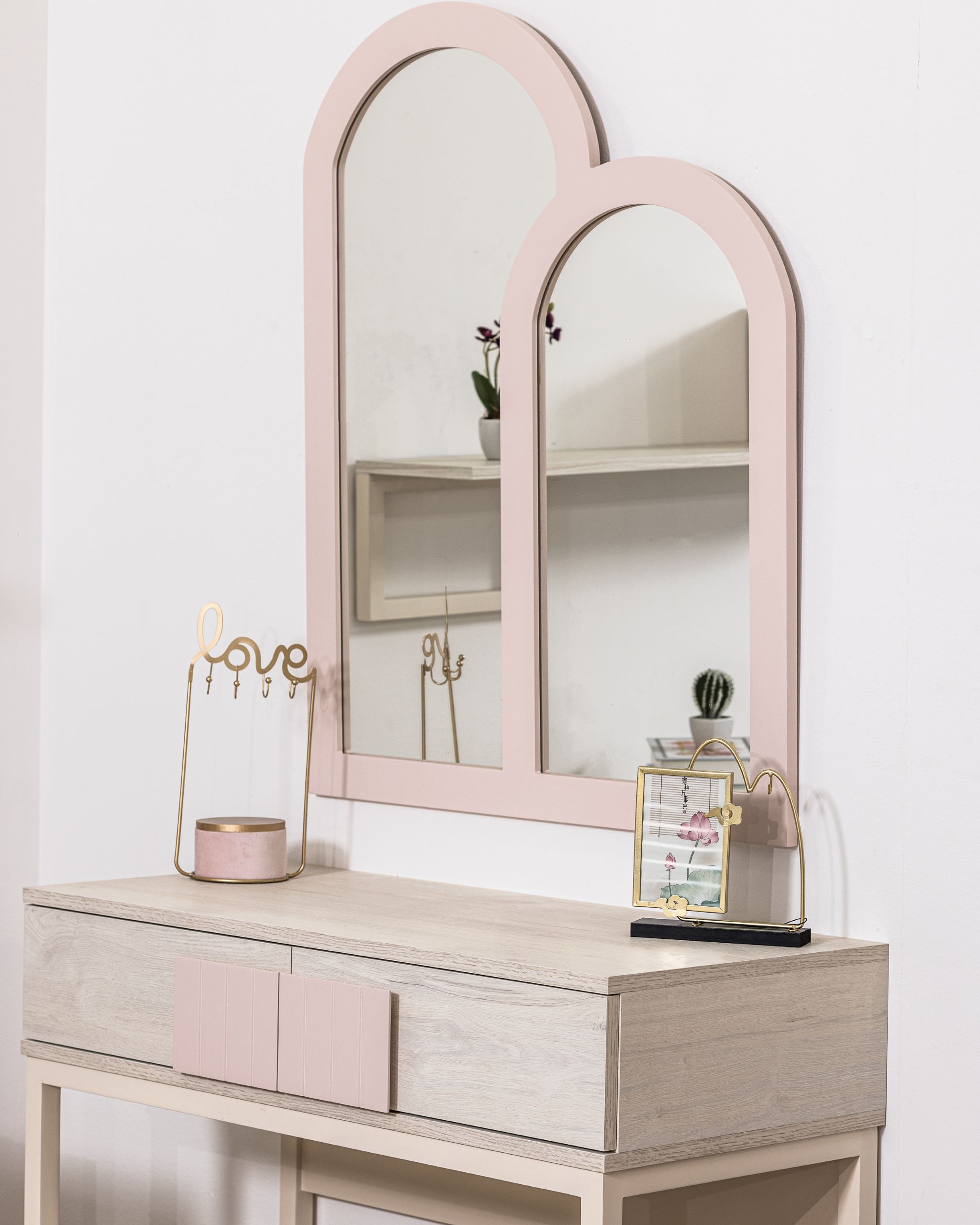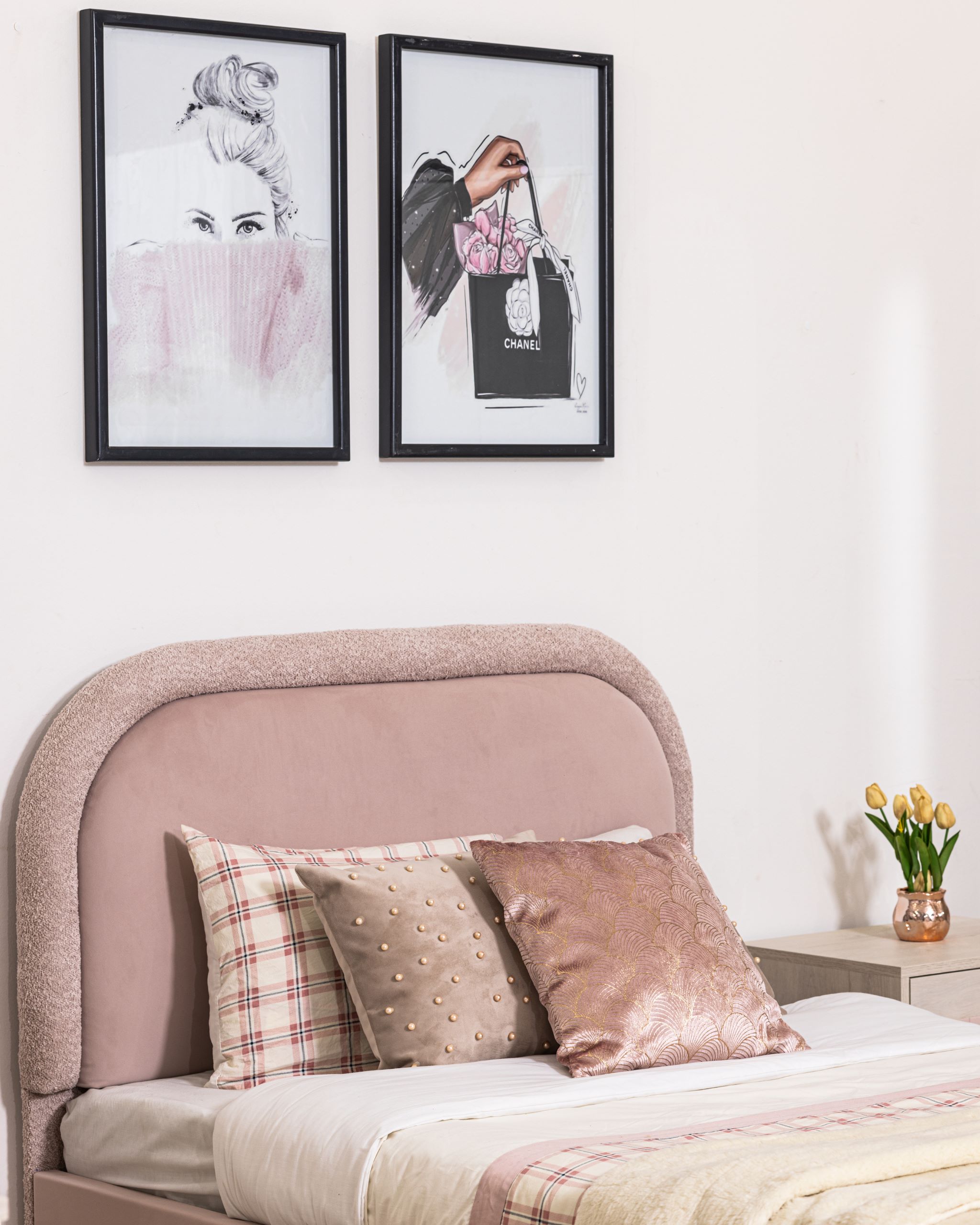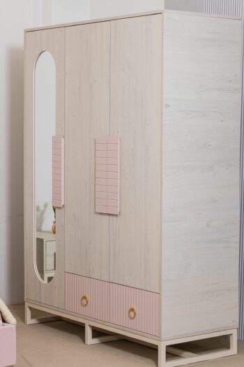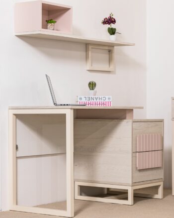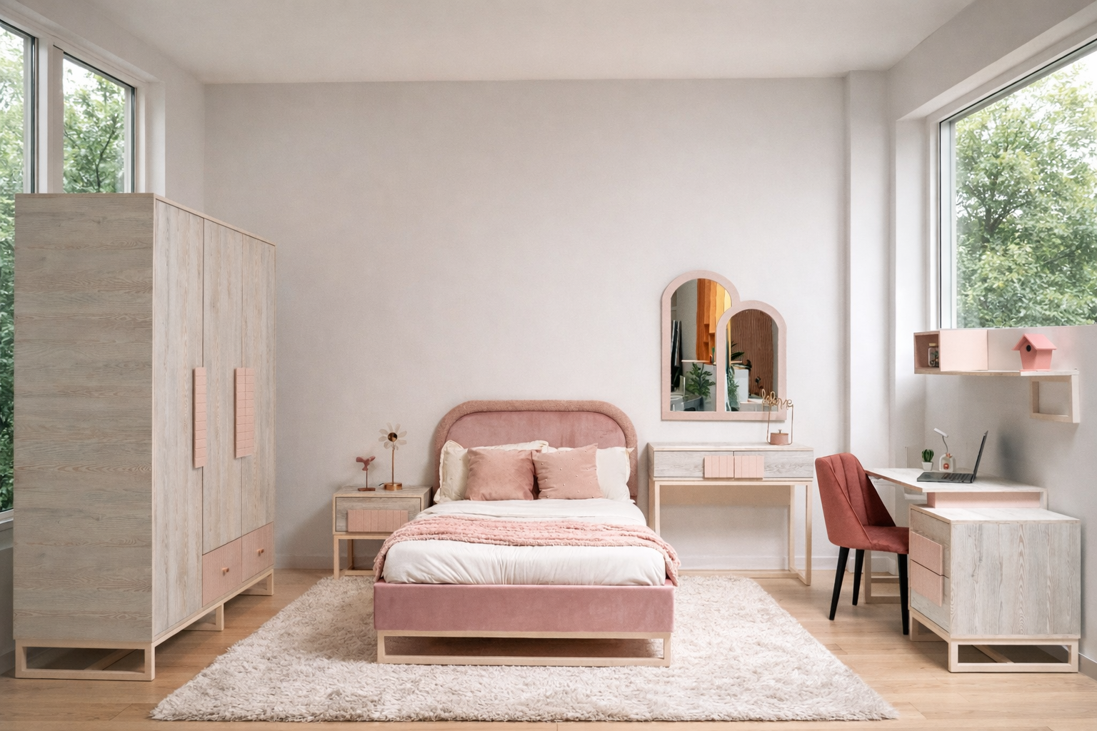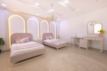 Cette chambre syrine en rose est un espace élégant et fonctionnel. Elle comprend un lit capitonné, une table de nuit pratique, une garde-robe spacieuse, une coiffeuse avec miroir, un bureau idéal pour l’étude, et une niche pour exposer des objets décoratifs. Chaque élément est conçu pour offrir confort et style, créant un environnement parfait pour grandir et s’épanouir.