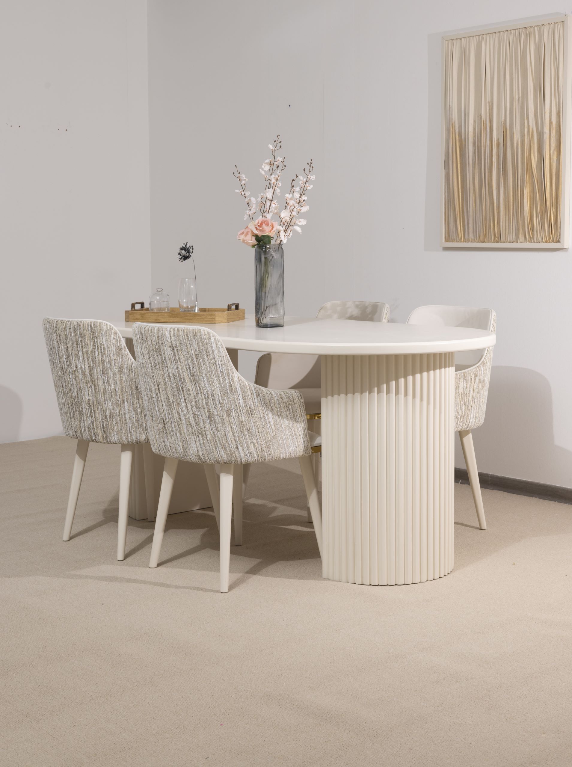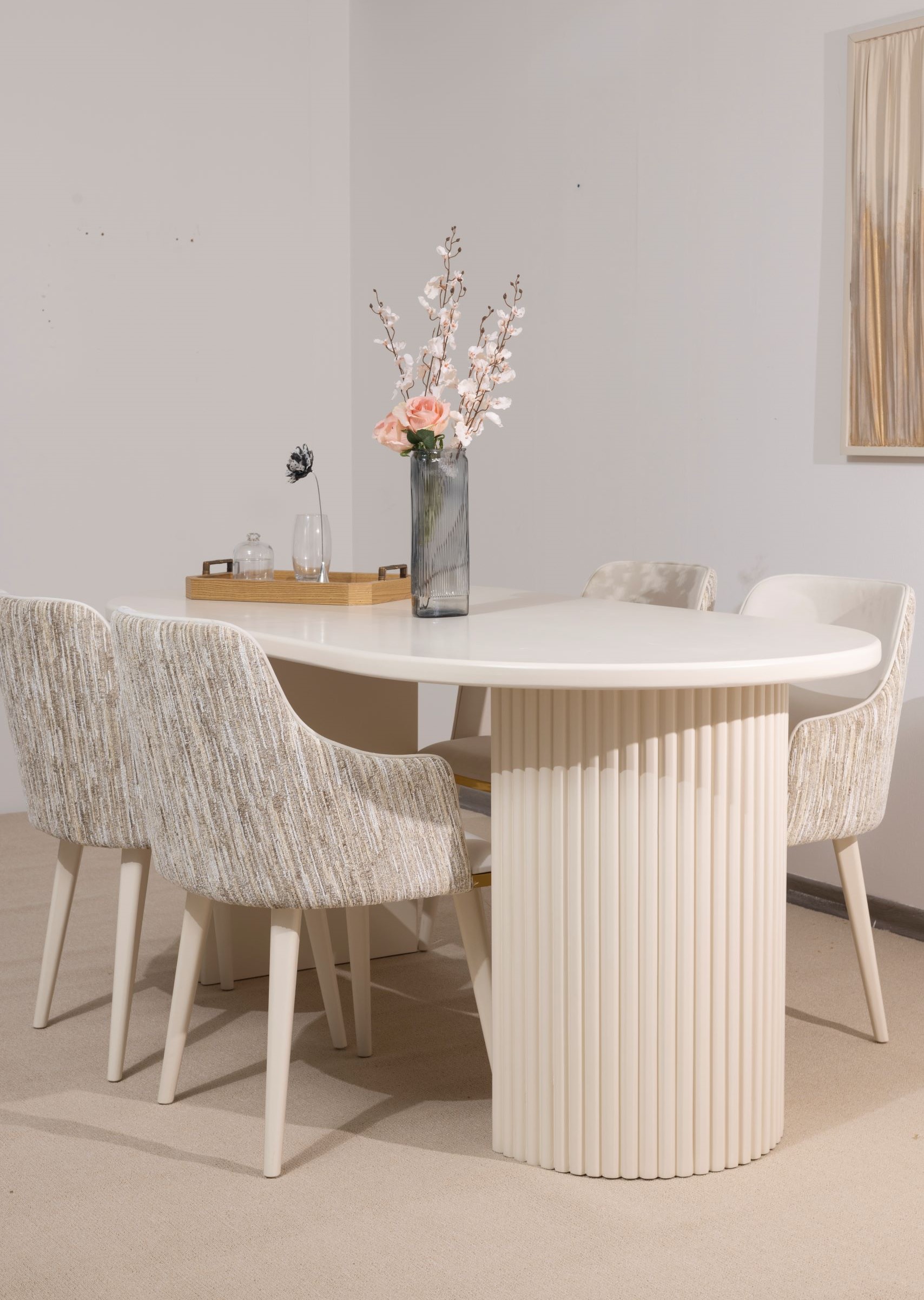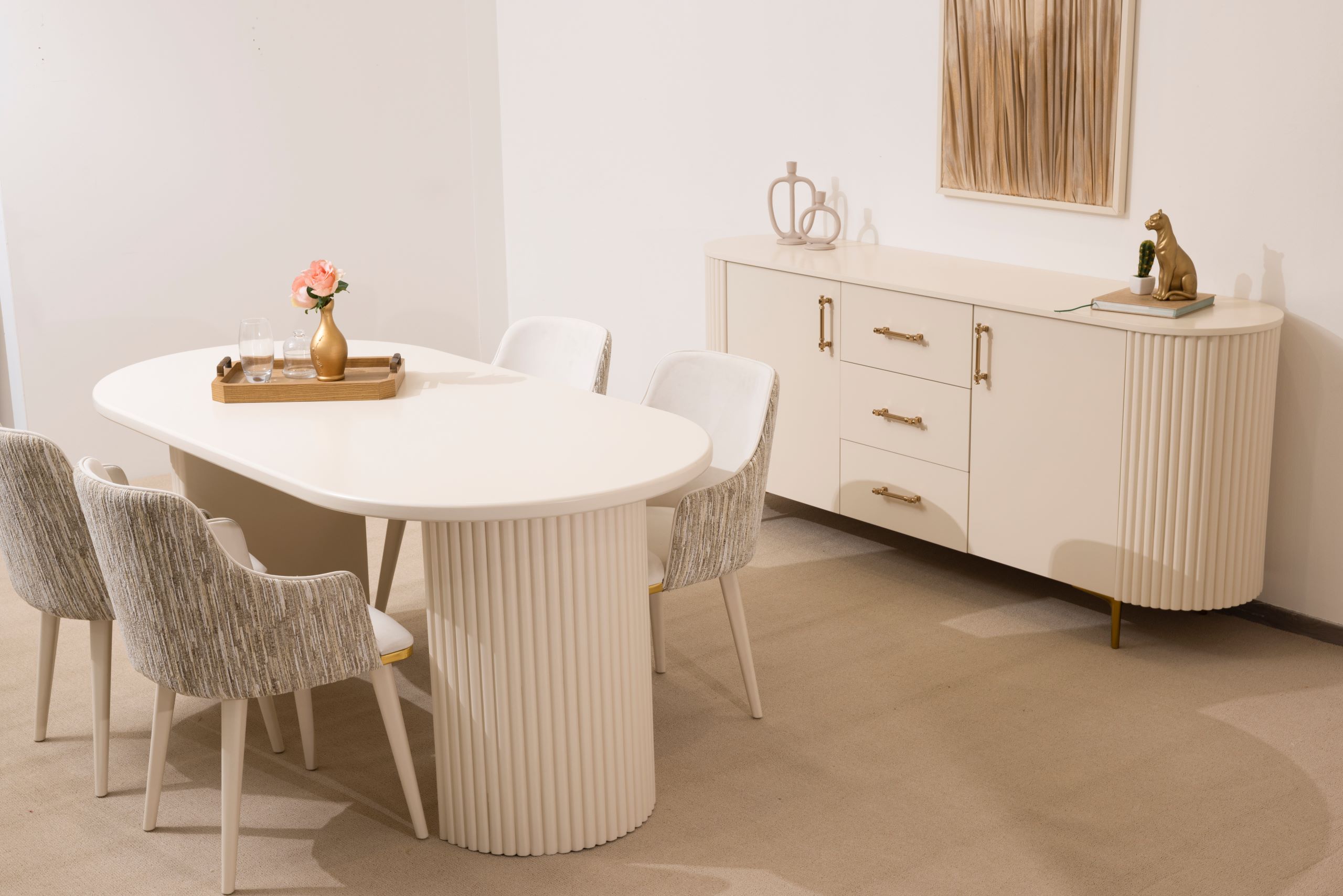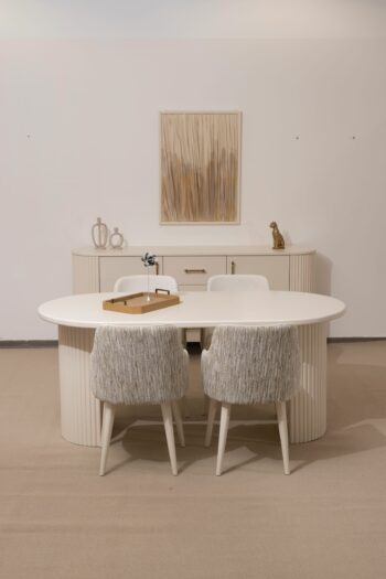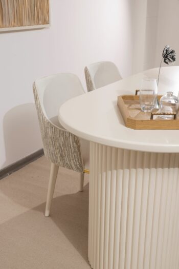 La table Camilia séduit par sa structure texturée unique et ses lignes douces arrondies, apportant une touche de modernité et de sophistication à votre salle à manger. Sa finition laquée mate met en valeur la beauté de ses pieds sculptés en relief, pour un rendu visuel à la fois sobre et captivant.